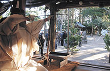 1月4日に一松神社で行われる御的神事は、その年の吉凶を占う珍しい行事です。宮司が神殿から15メートル離れた的に向かって4本の矢を放ち、その当たった場所と矢の走り具合を見て、その年の運勢と稲作の豊凶がわかるというものです。