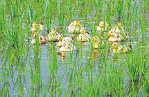 アイガモを田んぼに放して雑草や害虫を食べてもらう農法で、田植えから稲刈りまで農薬を使わない、「ちばエコ農産物」に認定されたお米です。オーナー制によるアイガモの放烏や稲刈り体験も実施しています。