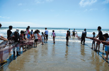大洗町では、観光客の方々(団体のみ。概ね30名から)へ地曳網体験を行っております。地曳網漁は、船で大きな網を海に広げ、大勢の人で網を引き魚を獲る昔ながらの漁法です。大勢で力を合わせて網を引き、大人も子供も盛り上がります。